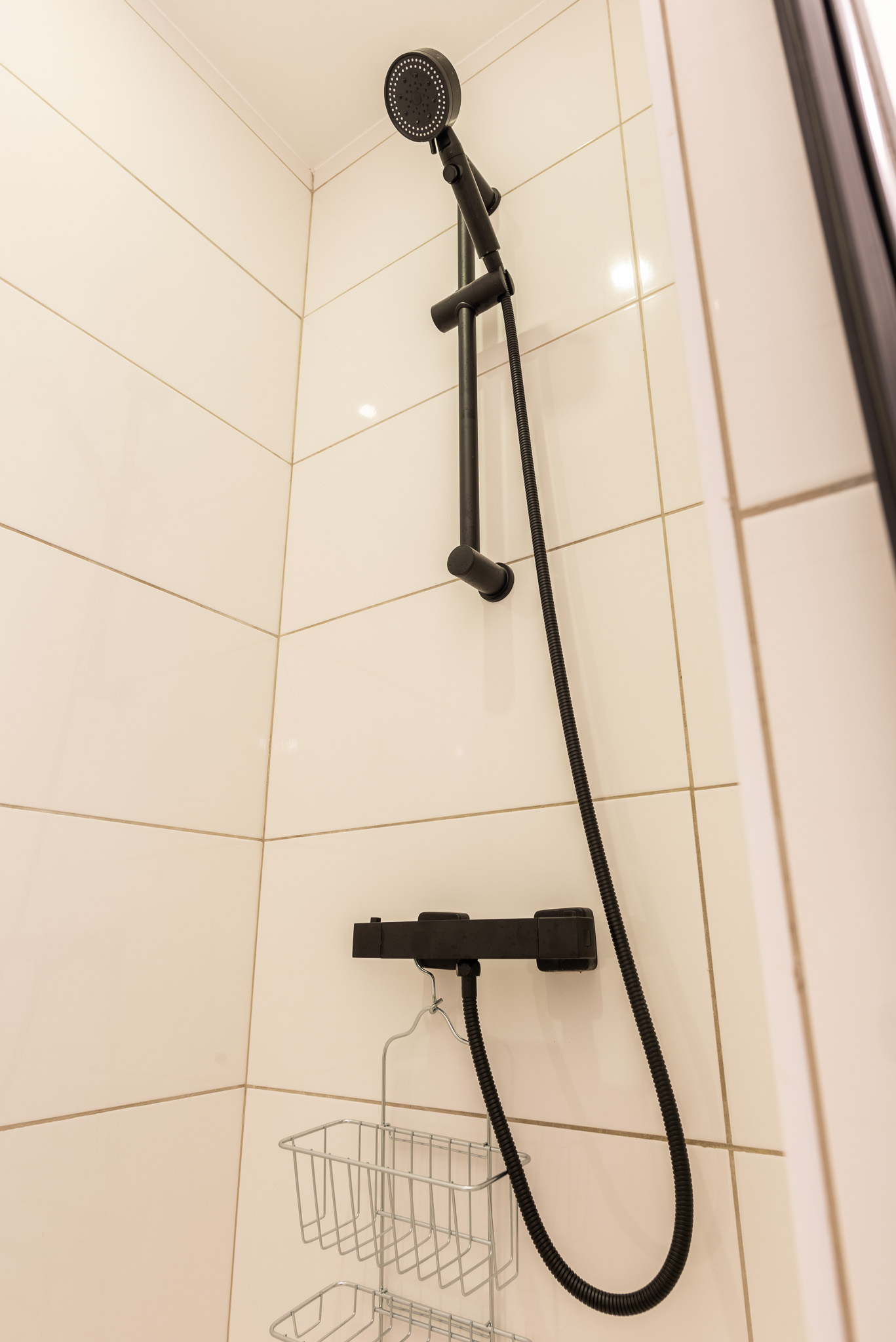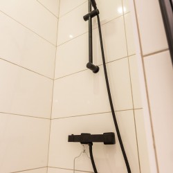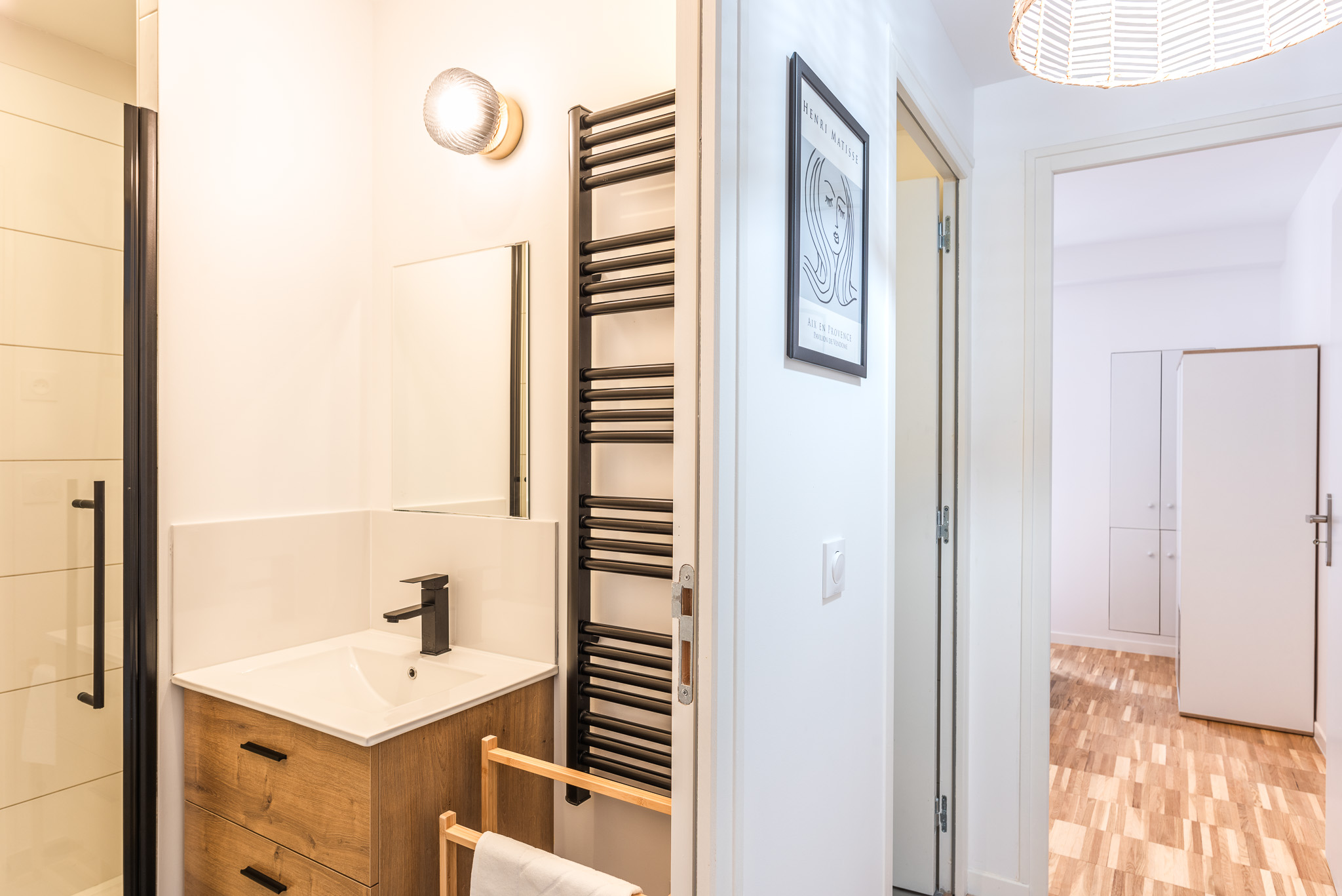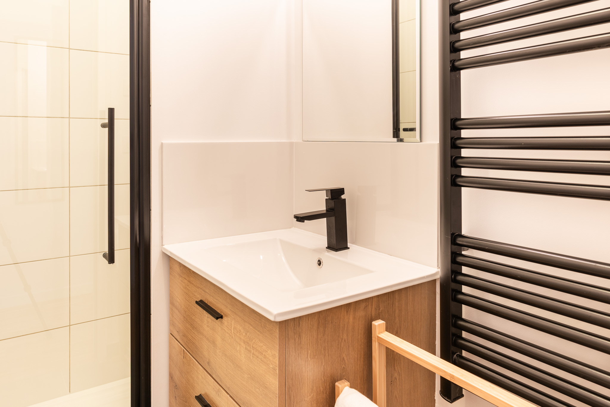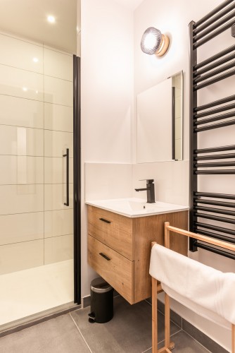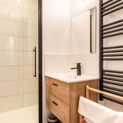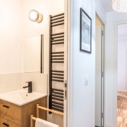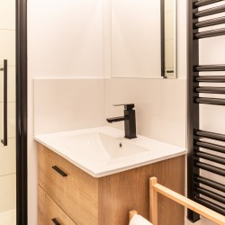 Salle de douche avec Lavabo et sèche serviettes.