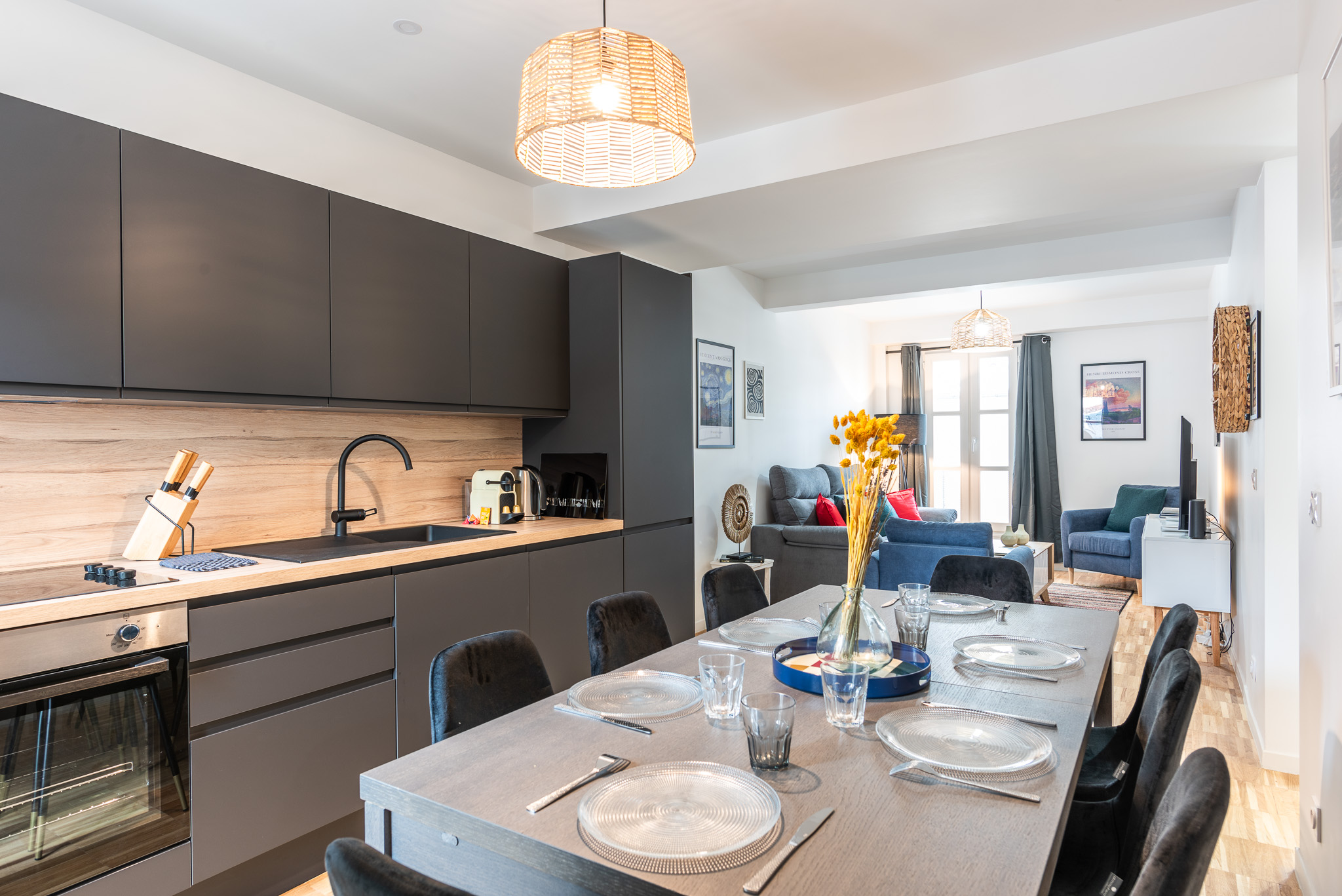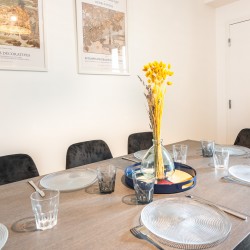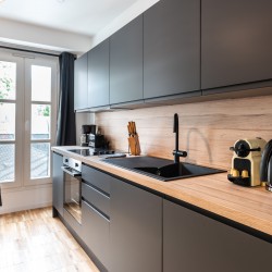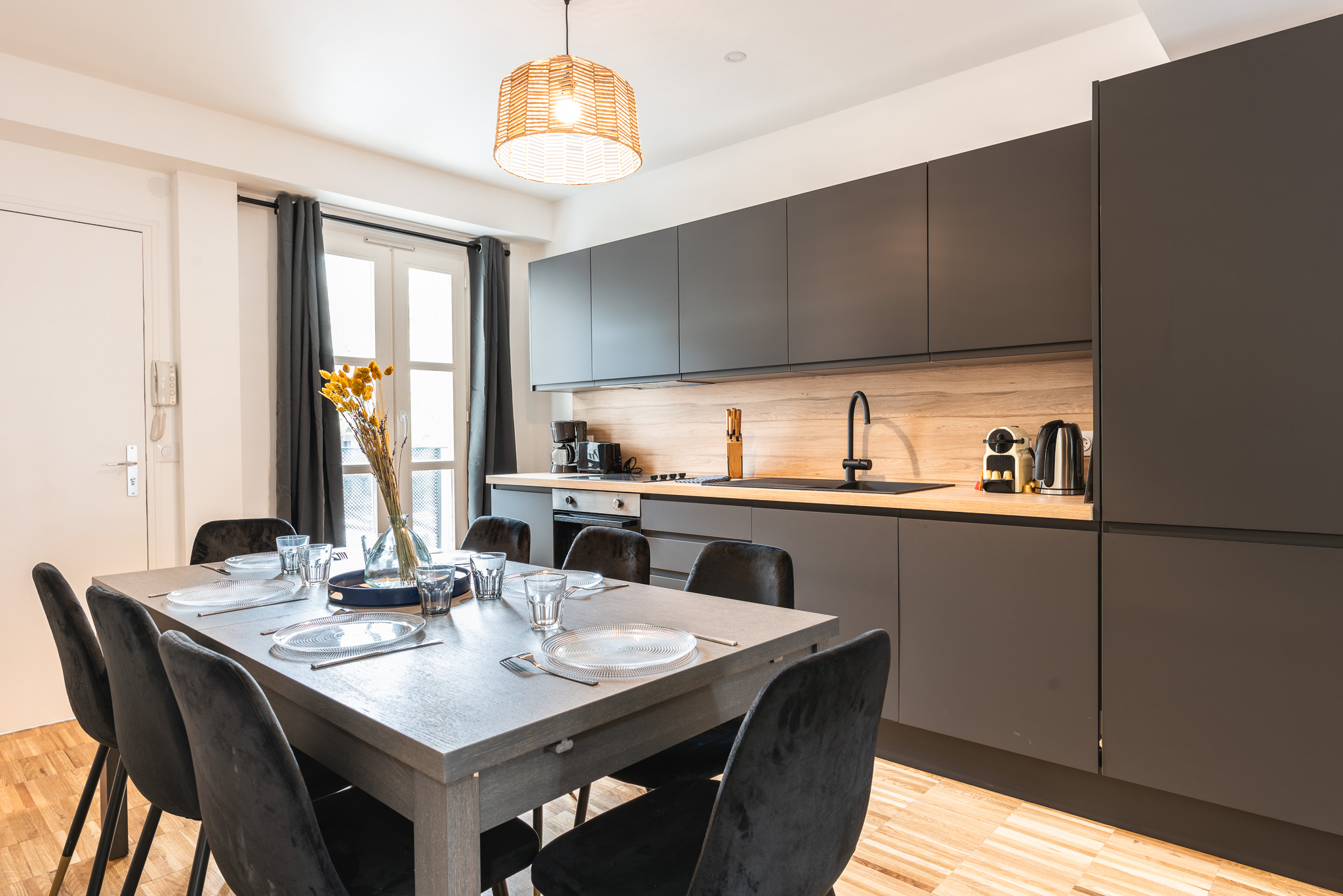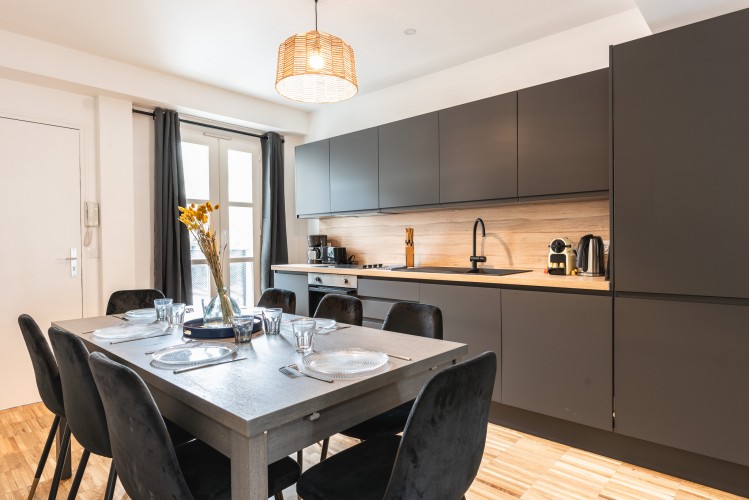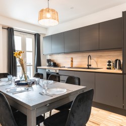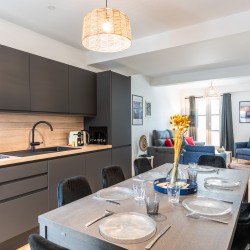 La cuisine est entièrement équipée : Plaques, four, réfrigérateur, congélateur, cafetière Nespresso, bouilloire, grille-pain, lave-vaisselle).