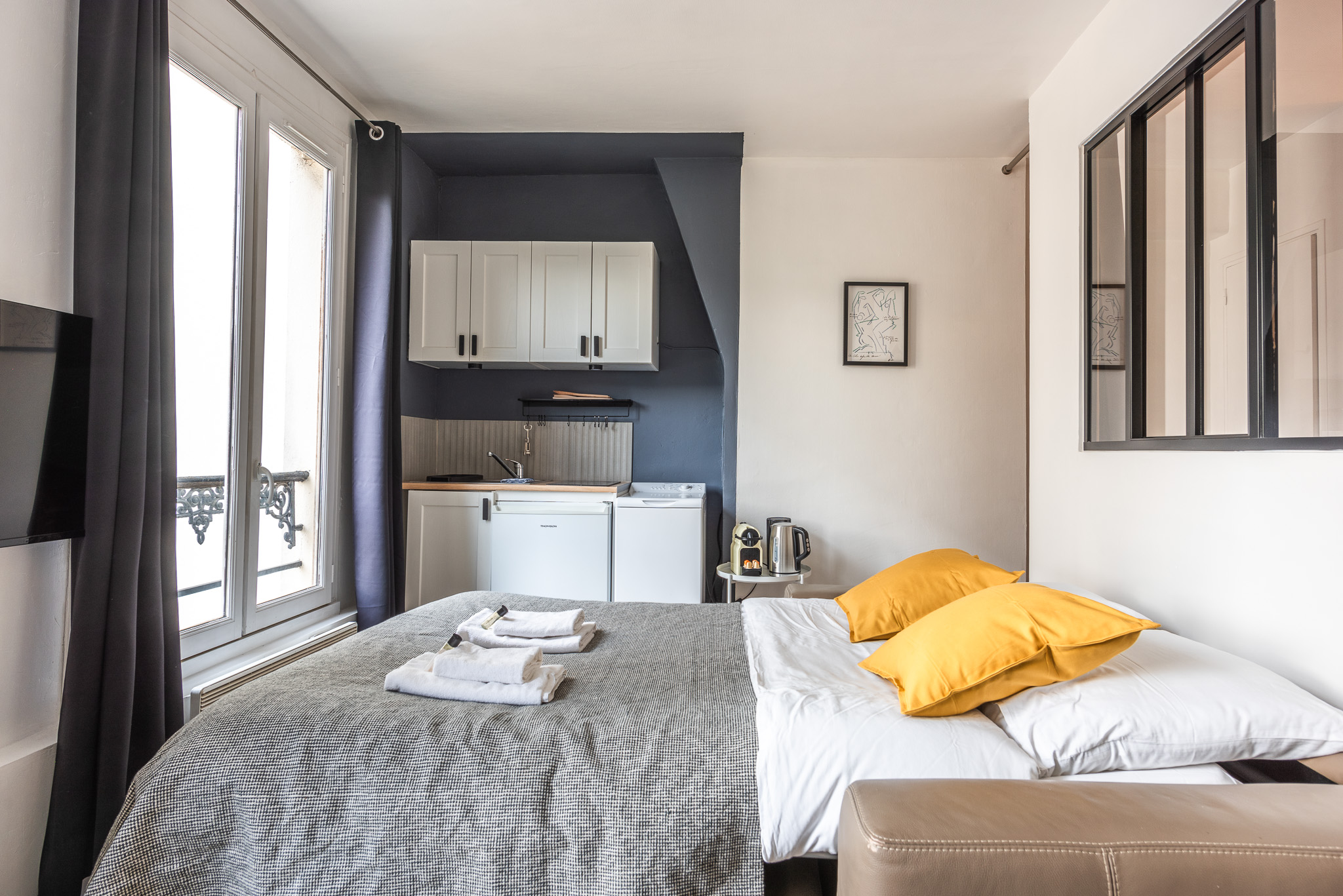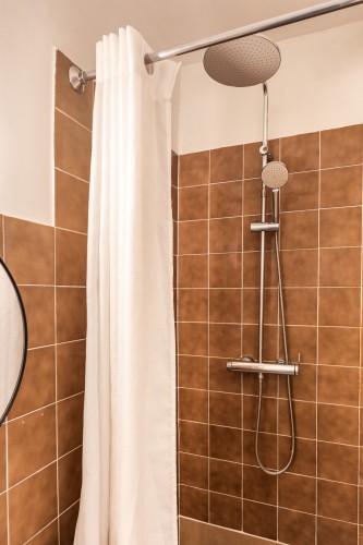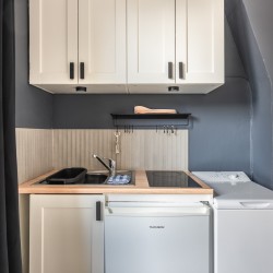 – 1 chambre double avec lit queen-size (160cm x 200cm), 1 Salle de bain avec douche, un séjour avec cuisine ouverte