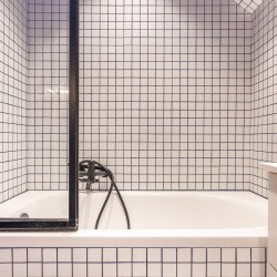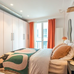 L’appartement peut accueillir 4 personnes. La chambre dispose d’un lit queen-size (160cm x 200cm) ainsi qu’une salle de bain avec une belle baignoire. Le séjour est équipé d’un canapé-lit très confort avec lit double 140cm x 200cm. La magnifique cuisine toute équipée est ouverte sur le séjour. Très bel espace pour prendre ses repas.