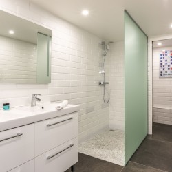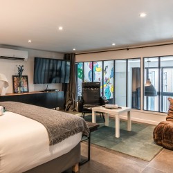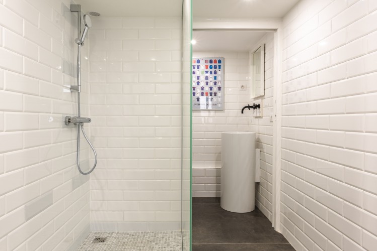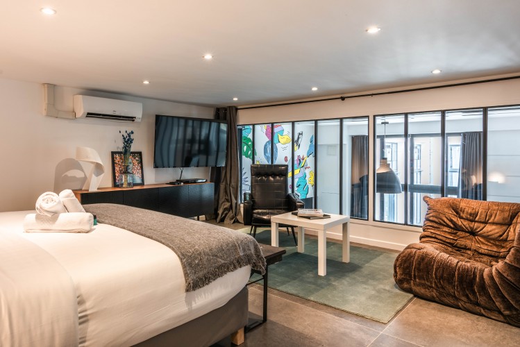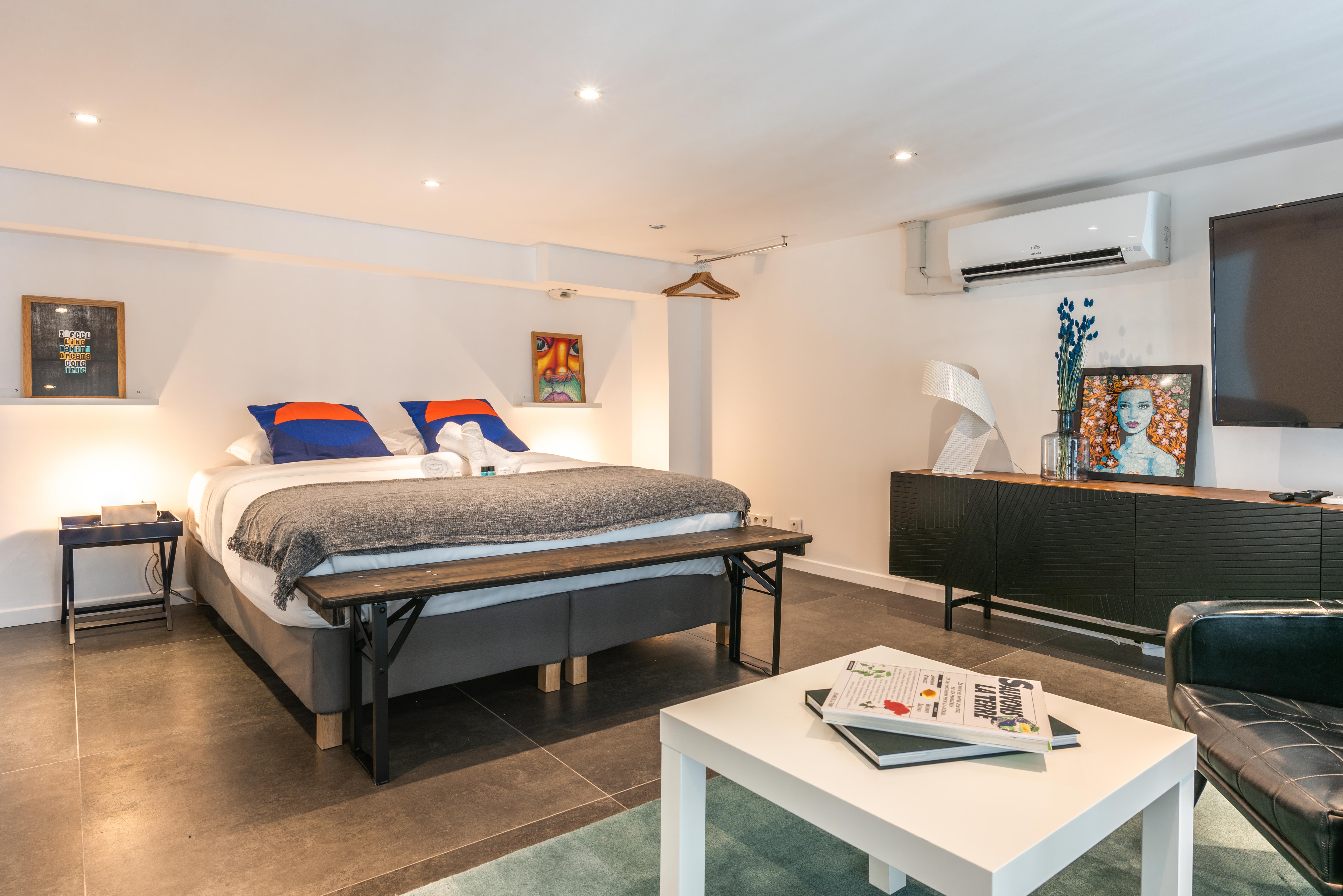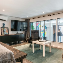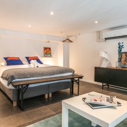 It is composed of a large living room with convertible queen size sofa, an open kitchen with all equipments (fridge, washing machine, dryer, dishwasher, Nespresso coffee machine, toaster, microwave, kettle, cooking plate, …). There is also a bar area for guests who like to have their meals this way.