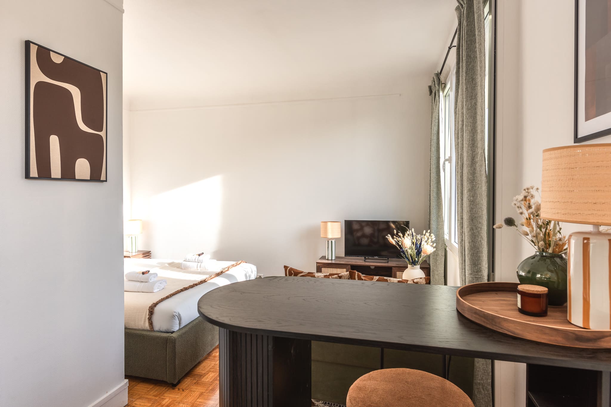 Charming studio fully refurbished by an architect, featuring a 5-star queen-size bed, a TV, high-speed Wi-Fi, a bathroom with a shower and WC, and a f...