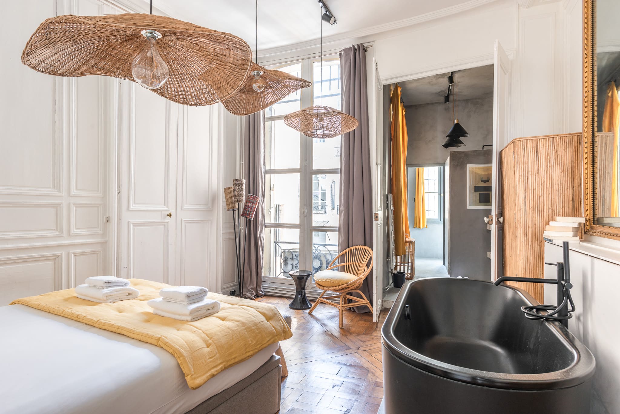 The apartment is a 103m2 (1100 sqft) spacious and fully equipped apartment. It has a large living room with sofas and TV, an open kitchen on a dining area, as well as 2 double bedrooms, 1 bathroom and 2 WC. The kitchen is modern and full Miele equipped : stove, oven, fridge, freezer, dishwasher, Nespresso, toaster, kettle, etc. Bedroom 1 : Double bedroom with queen size bed (160x200), lockers, bathtub and access to en-suite bathroom with shower and WC. Bedroom 2 : Double bedroom with queen size bed (160x200), working area with desk. The apartment is located at the 2nd floor (no elevator) of a standing and charming building of the 17th century. It is very quiet and luminous whilst in the most exciting area : 100meters away from the Seine river, 2 min walk from Saint-Michel, 5 min walk from Notre-Dame and Saint-Germain des près.