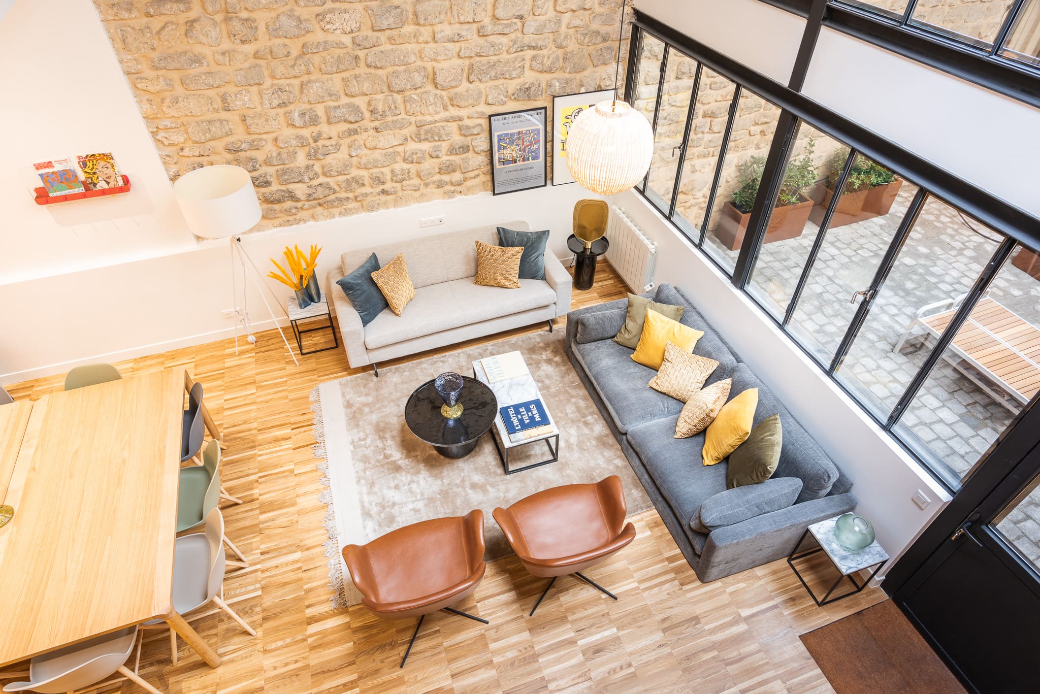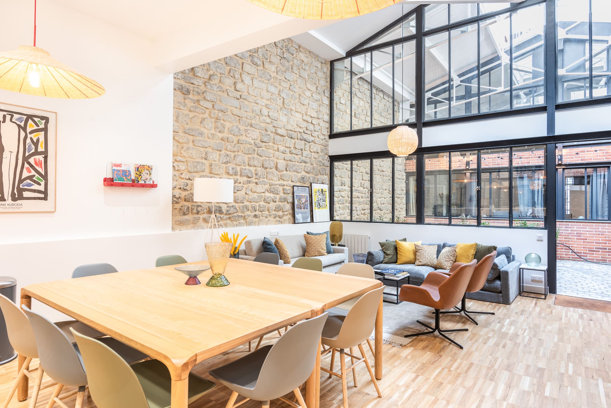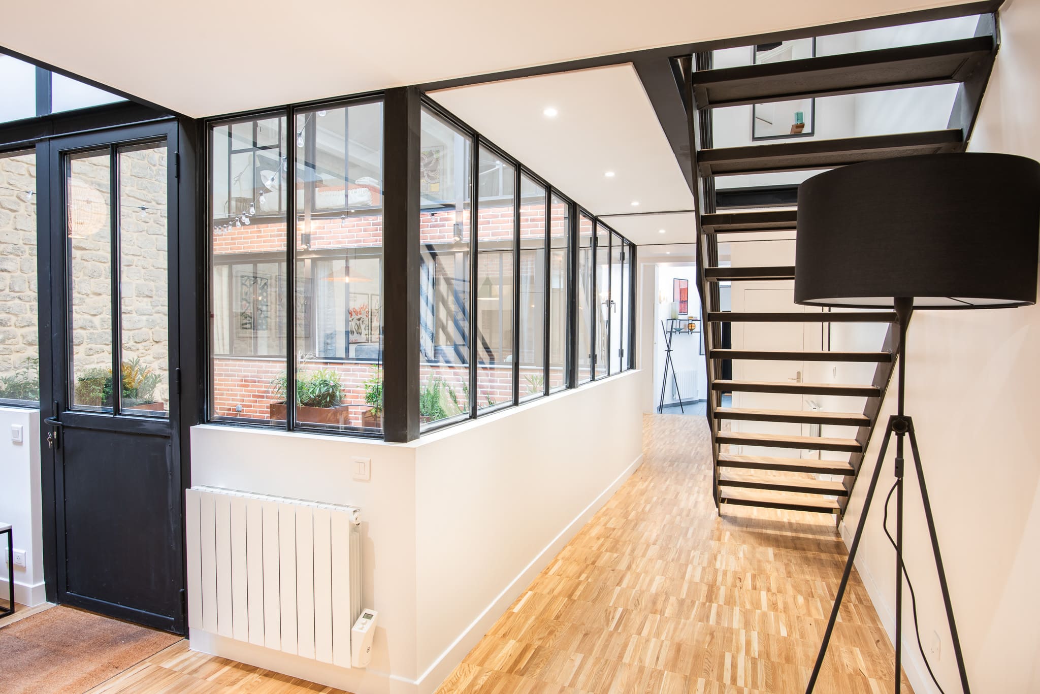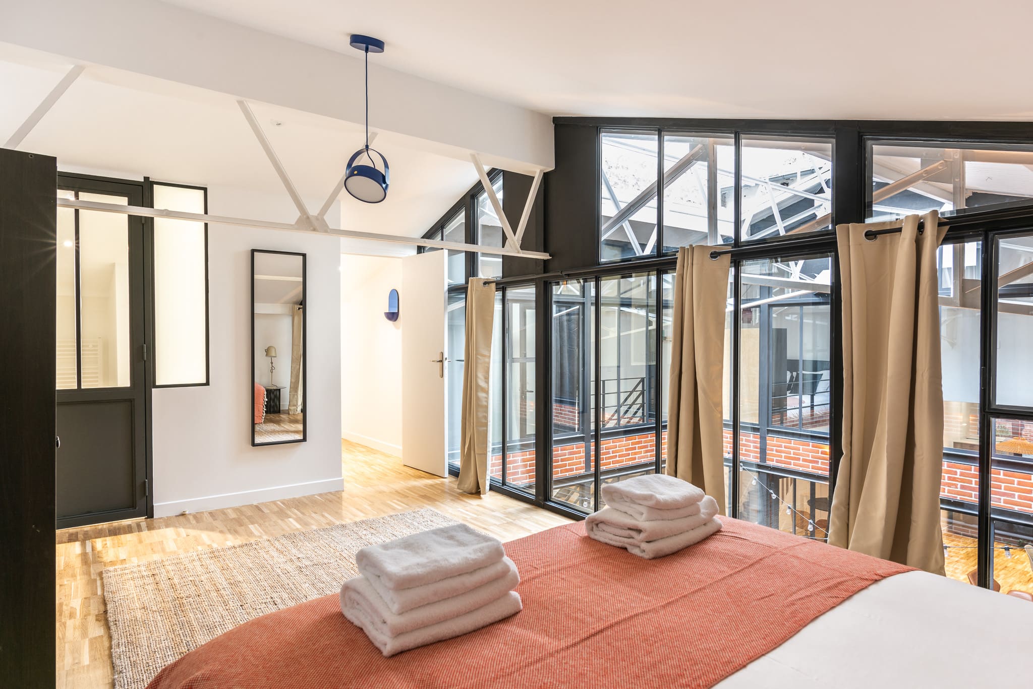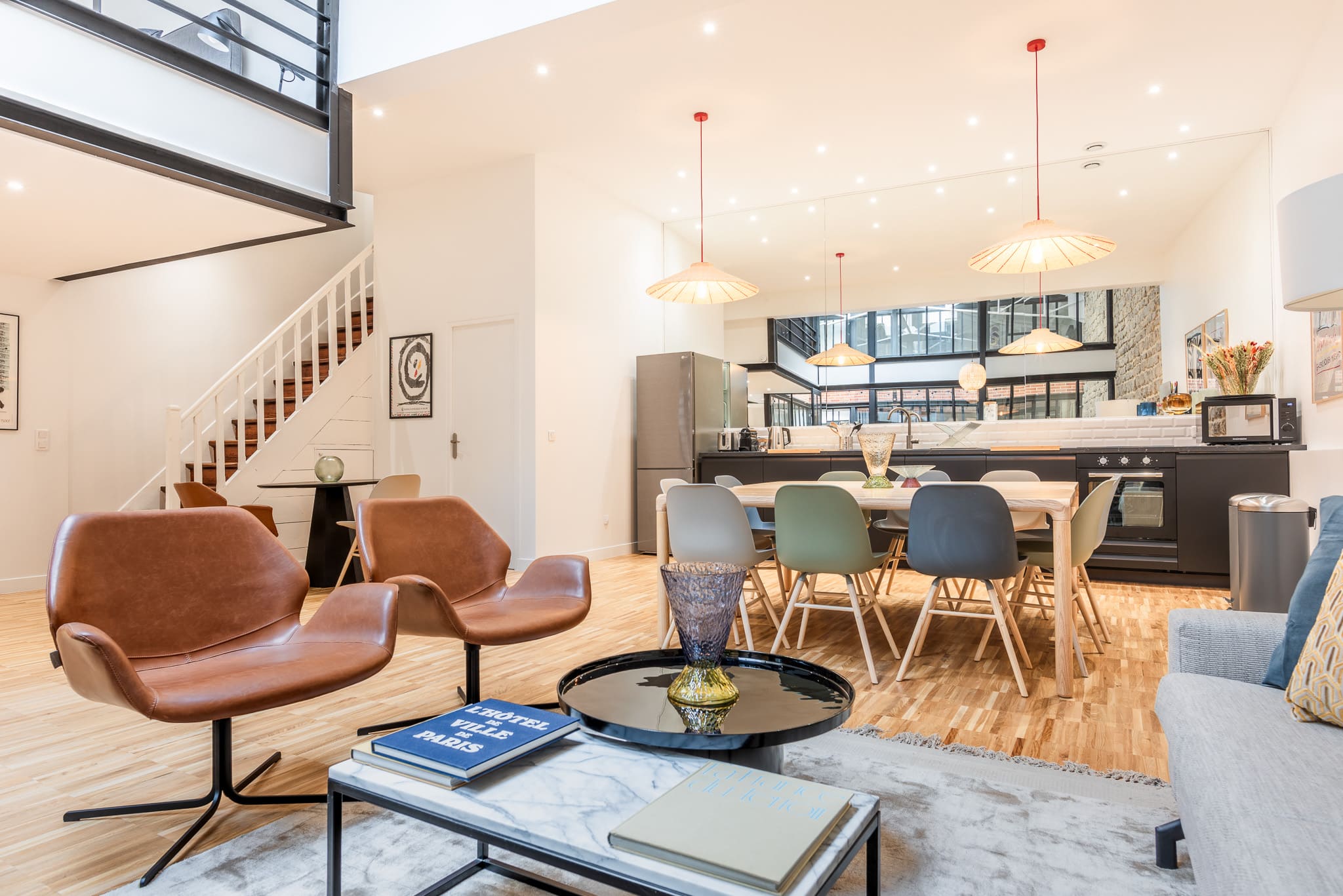 The loft is a 190m2 (about 1900 sq ft.) flat which has been totally refurbished by an architect and high quality / design materials and furniture. It has a large living room with TV (Apple TV + Netflix) and a working space as well as a dining area. It has 5 double bedrooms with Queen size, 4 bathrooms and 4 toilets. 3 bedrooms have en-suite bathroom, 2 bedrooms are sharing the last one. The kitchen is fully equipped with cooking plate, microwave, fridge, Nespresso machine, kettle, pans, toaster, washing machine, dishwasher, oven, ...) and a dining area. ALL windows have blinds to bring darkness and privacy. The loft is at the ground floor of a nice typical Parisian building in a courtyard. It is very quiet. It has a private patio which is also very beautiful.
