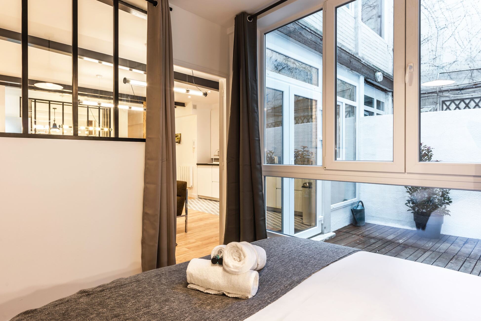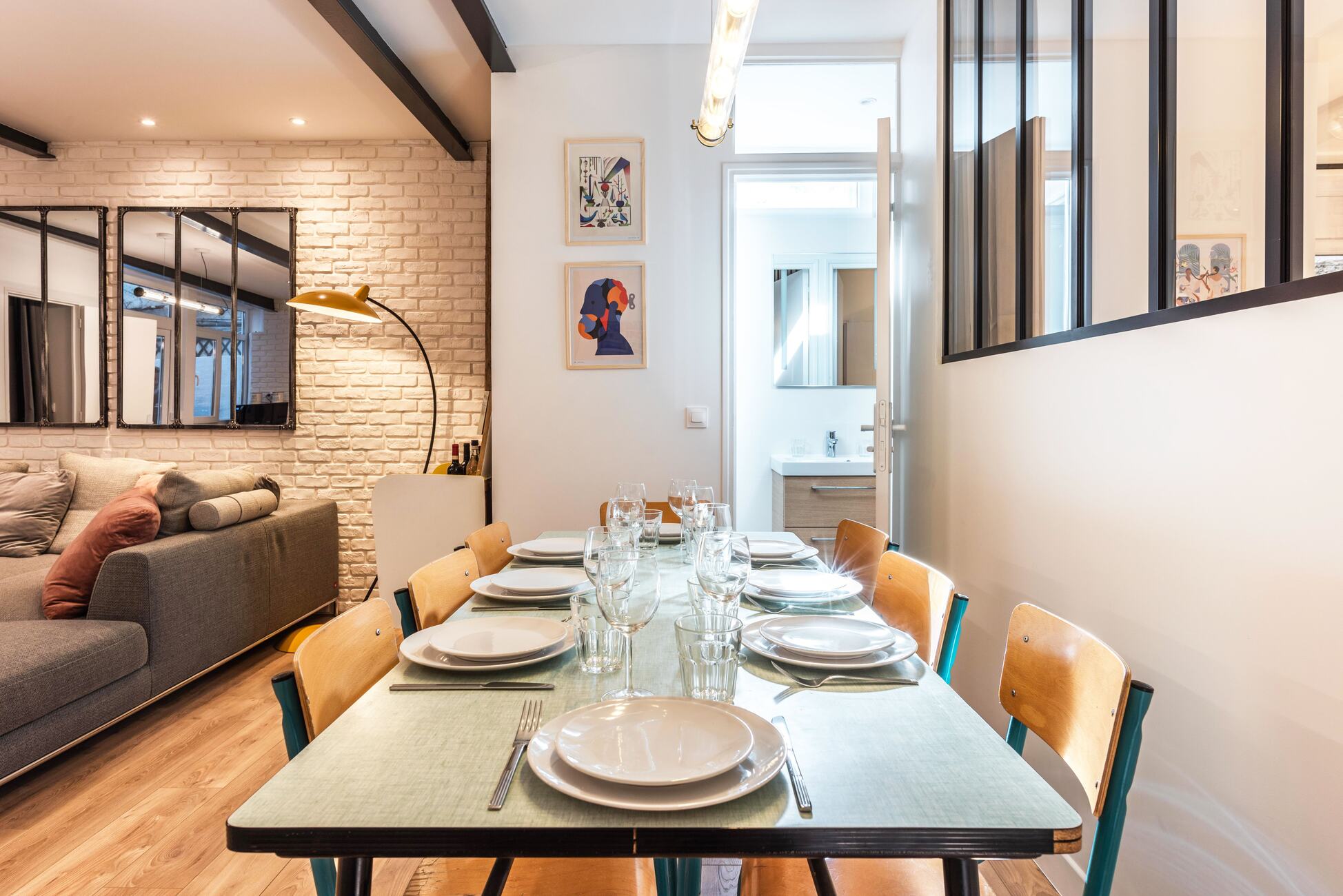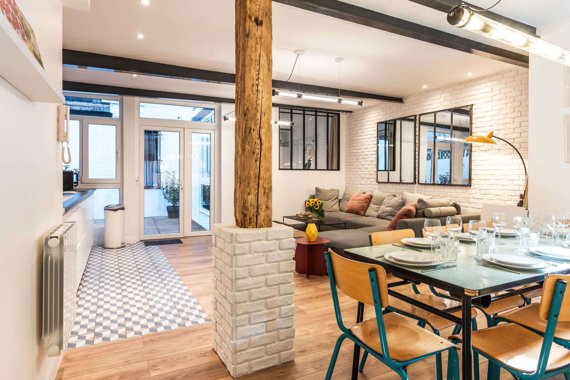 The loft is a 95m2 (about 1000 sq ft.) flat which has been totally refurbished by an architect and high quality / design materials and furniture. It has a large living room with sofa, TV (cable + Netflix) and a dining space. It has an open kitchen with all equipments and 4 double bedrooms with 4* Queen size beds (160x200), 2 bathrooms with toilets (one is separate). The kitchen is fully equipped with cooking plate, microwave, fridge, Nespresso machine, kettle, pans, toaster, washing machine, dryer, dishwasher, ...). Bedroom 1 : Double bed (160x200), closet, and a window on the terrasse outside. Bedroom 2 : Double bed (160x200), a private bathroom with toilets, and a window on the patio outside. Bedroom 3 : Double bed (160x200), a wardrobe, and a window on the patio outside. Bedroom 4 : Double bed (160x200), and a closet. Curtains are almost everywhere to bring darkness by night and privacy. The loft is at the ground floor in a courtyard of a nice typical Parisian building. It is very quiet.