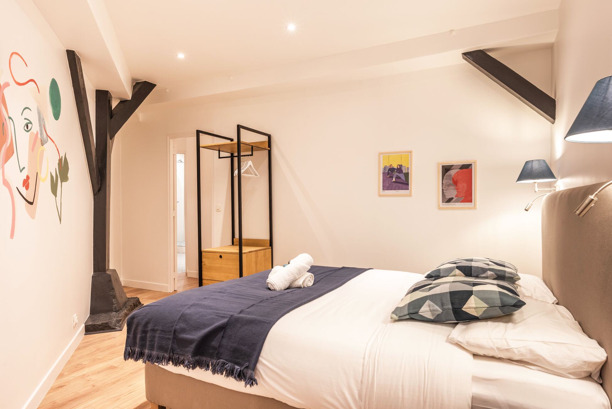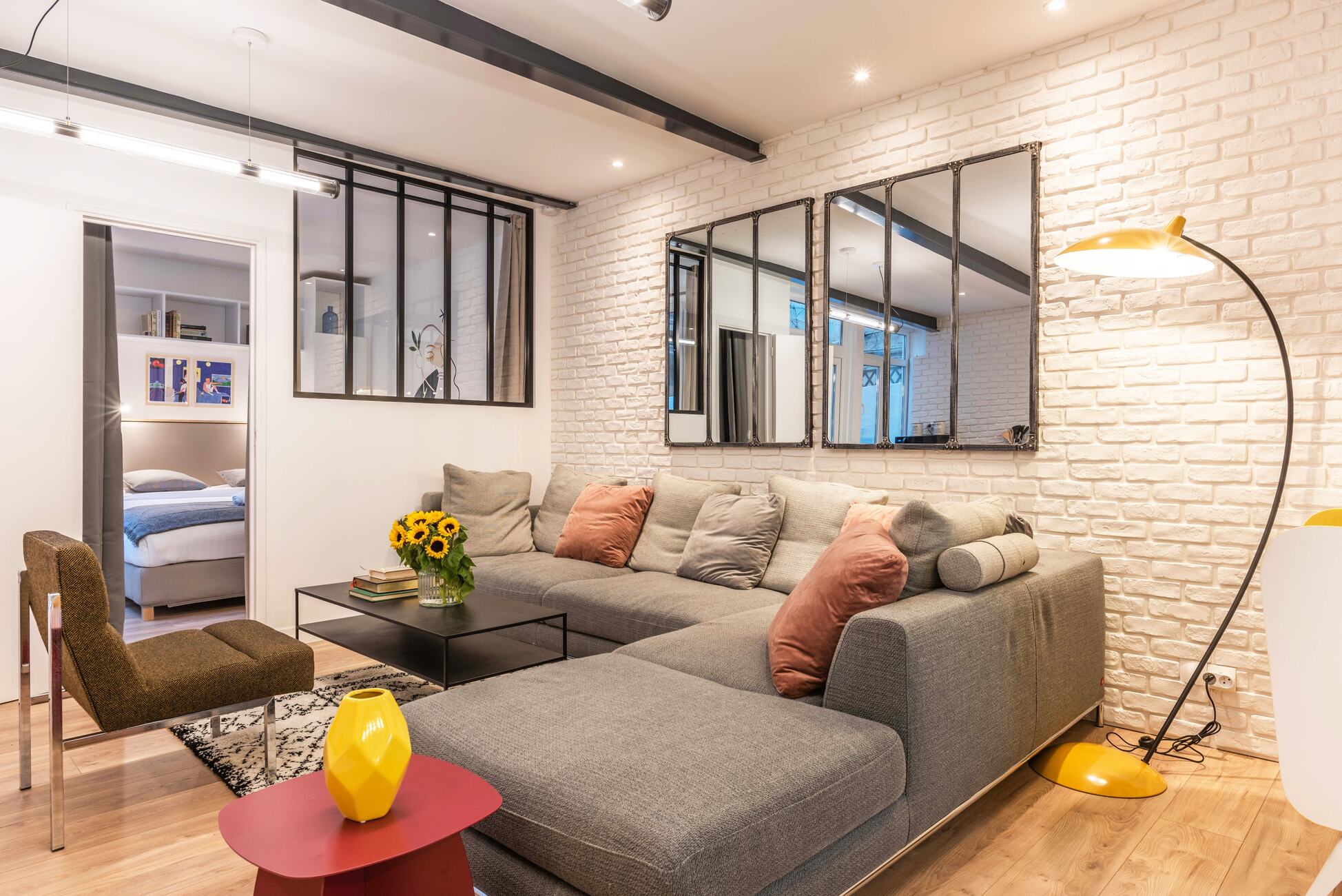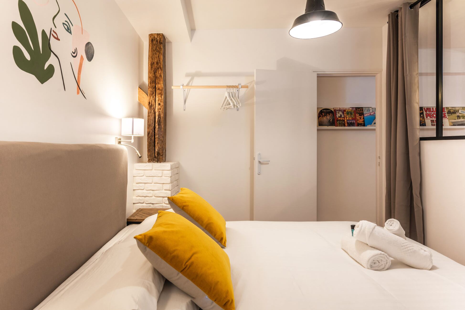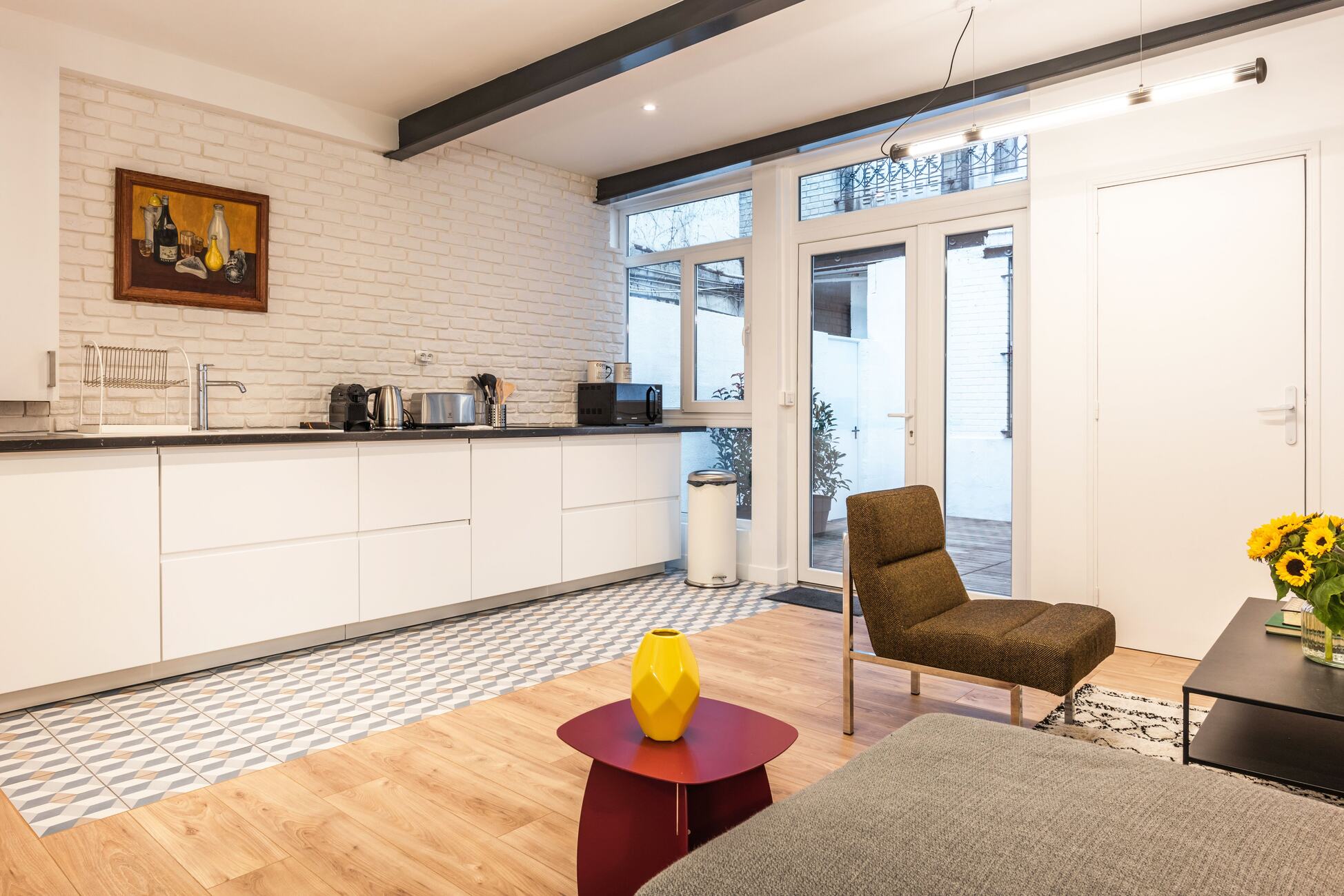 The loft is a 95m2 (about 1000 sq ft.) flat which has been totally refurbished by an architect and high quality / design materials and furniture. It has a large living room with sofa, TV (cable + Netflix) and a dining space. It has an open kitchen with all equipments and 4 double bedrooms with 4* Queen size beds (160x200), 2 bathrooms with toilets (one is separate). The kitchen is fully equipped with cooking plate, microwave, fridge, Nespresso machine, kettle, pans, toaster, washing machine, dryer, dishwasher, ...). Bedroom 1 : Double bed (160x200), closet, and a window on the terrasse outside. Bedroom 2 : Double bed (160x200), a private bathroom with toilets, and a window on the patio outside. Bedroom 3 : Double bed (160x200), a wardrobe, and a window on the patio outside. Bedroom 4 : Double bed (160x200), and a closet. Curtains are almost everywhere to bring darkness by night and privacy. The loft is at the ground floor in a courtyard of a nice typical Parisian building. It is very quiet.