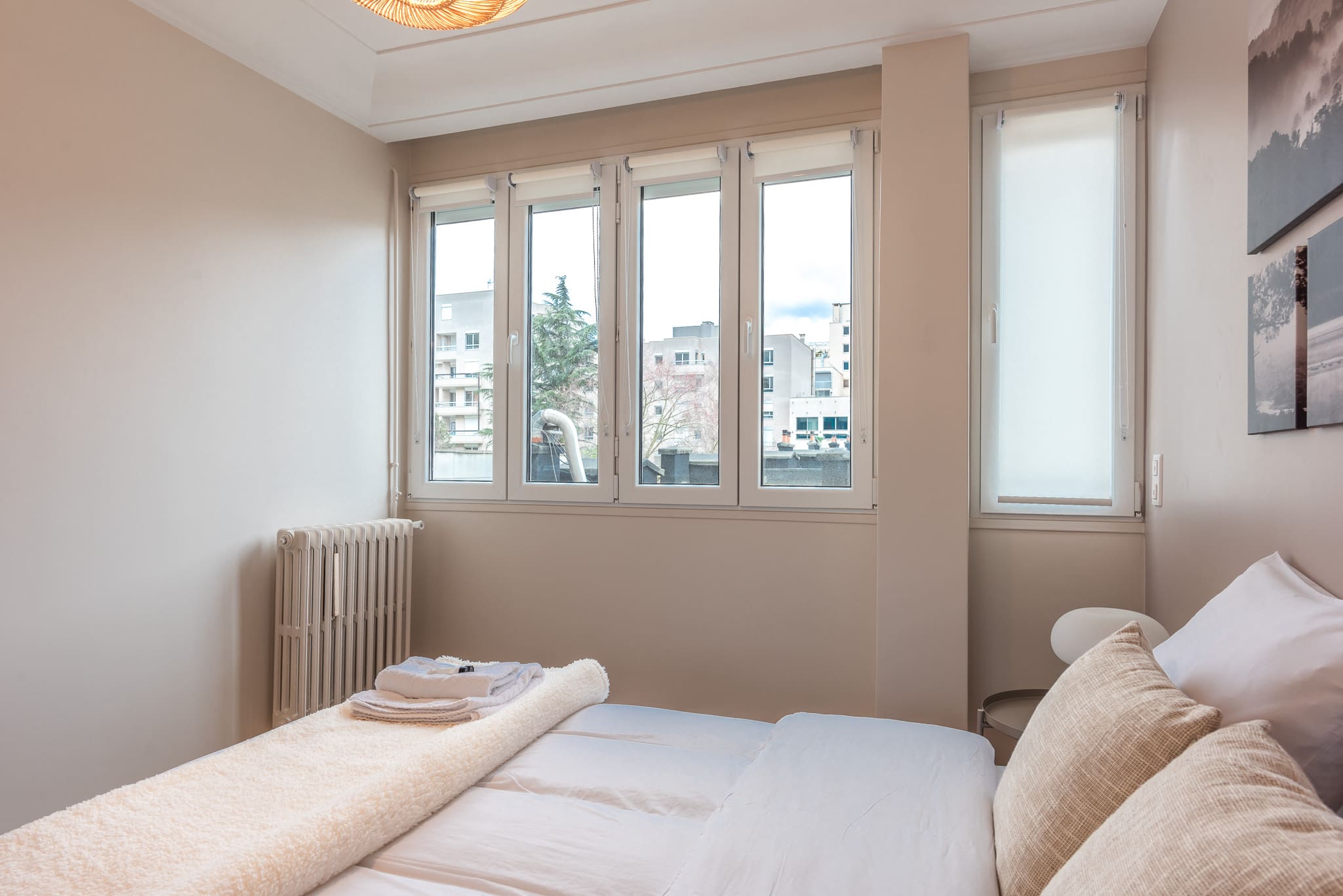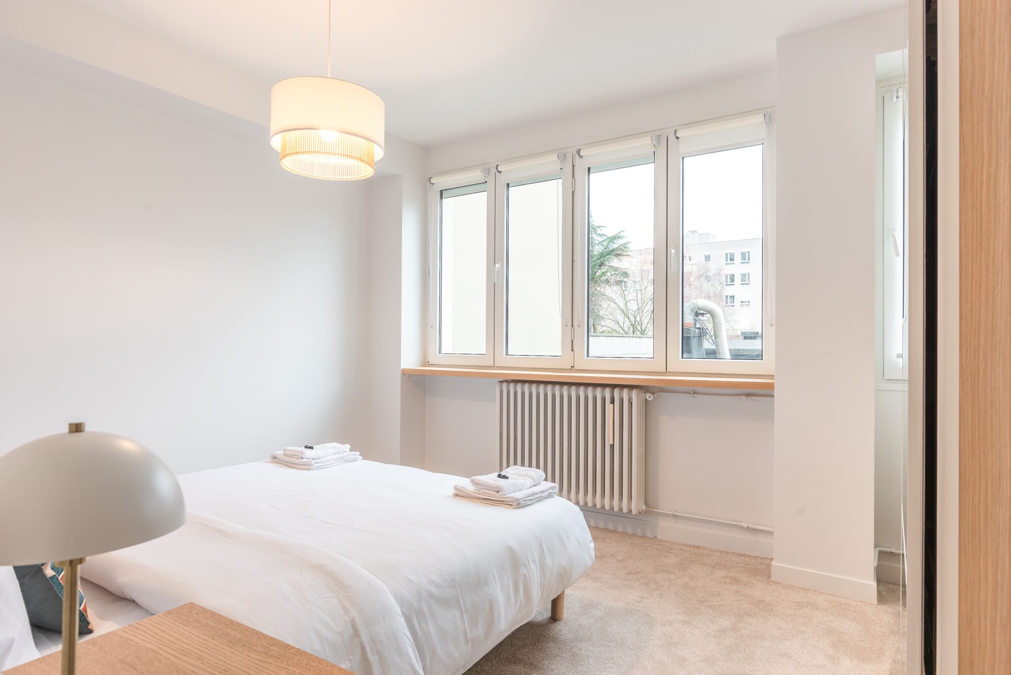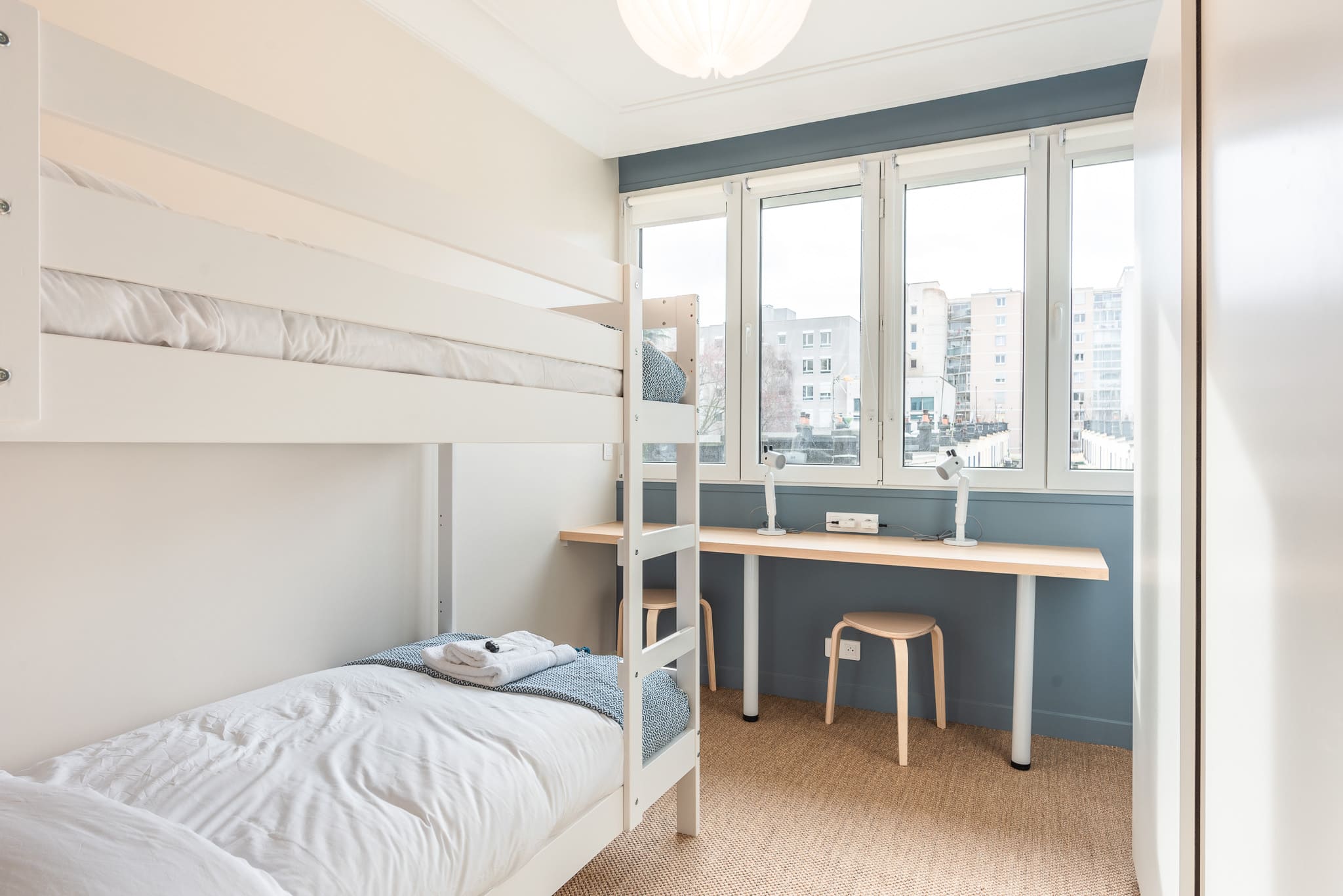 The apartment measures 120m2 and has been completely refurbished by an architect using high-quality materials and furnishings. It's just a 5-minute walk from Le Kremlin-Bicètre station, which takes you to the center of Paris in 15 minutes: Châtelet, Opéra, Gare de l'Est It comprises a large living room with kitchen opening onto a dining area for 8 people. A large living room with sofa bed and TV, a dining area, 3 double bedrooms with 5-star beds, 2 bathrooms with WC (1 with bath) and a fully-equipped kitchen (induction hob, oven, microwave, fridge, freezer, Nespresso coffee maker, kettle, toaster, dishwasher). Bedroom 1: Master bedroom with 160x200 bed, closet and double windows with shutters. Bedroom 2: Double room with 160x200 bed, closet and double windows with shutters. Bedroom 3: Double room with 2 bunk beds, desk area, closet and double windows with shutters. Office space and large closets available in hallway. Living room: Sofa bed 140x200 The apartment is located on the 2nd floor with elevator of a secured building. Quiet location. It also has a private terrasse