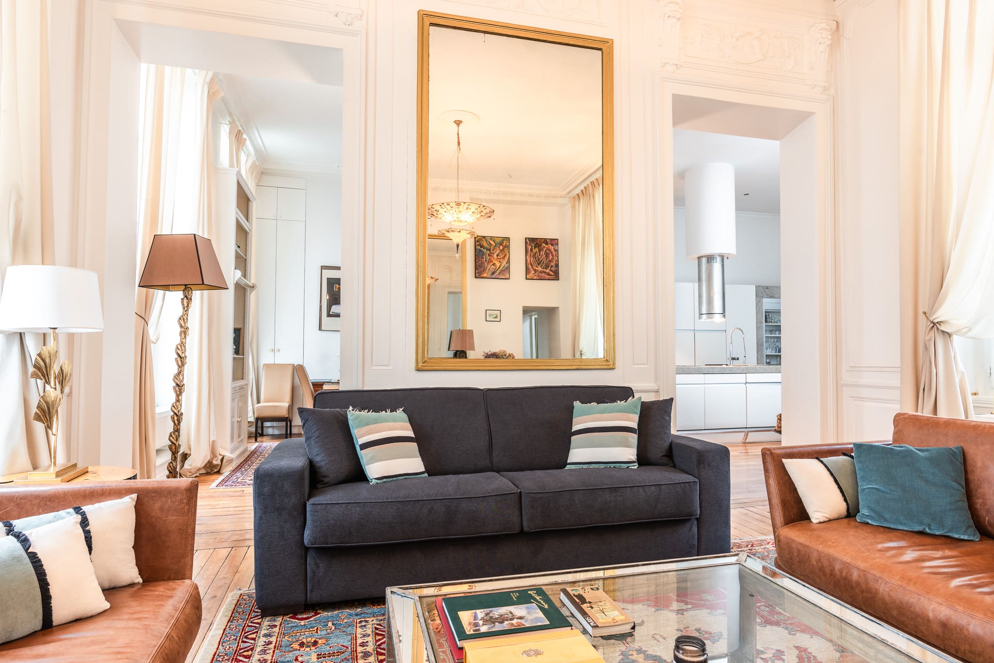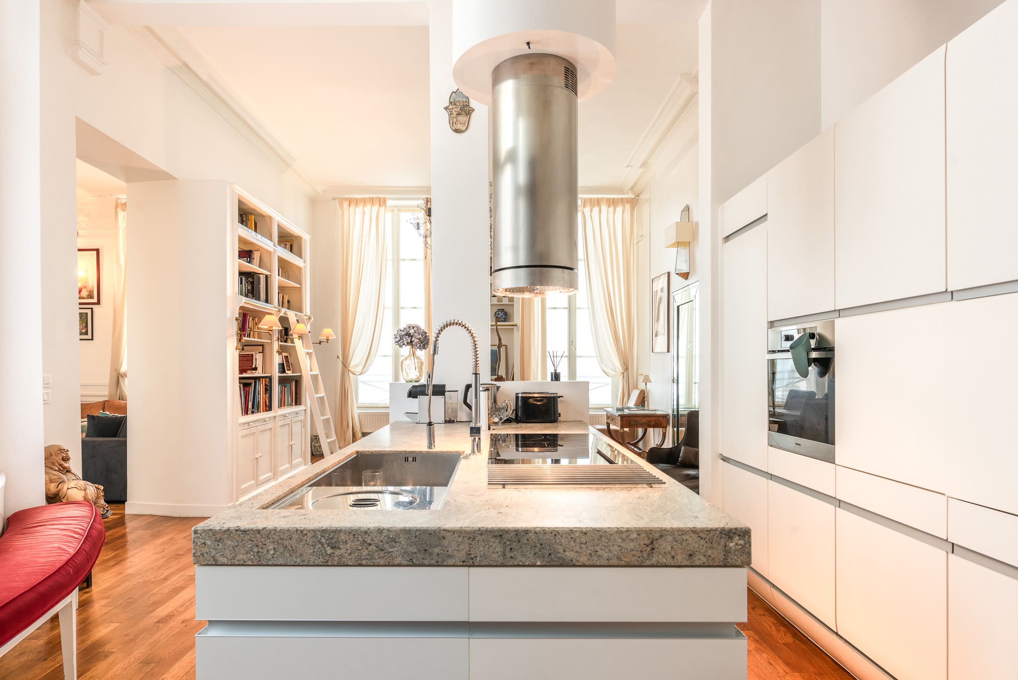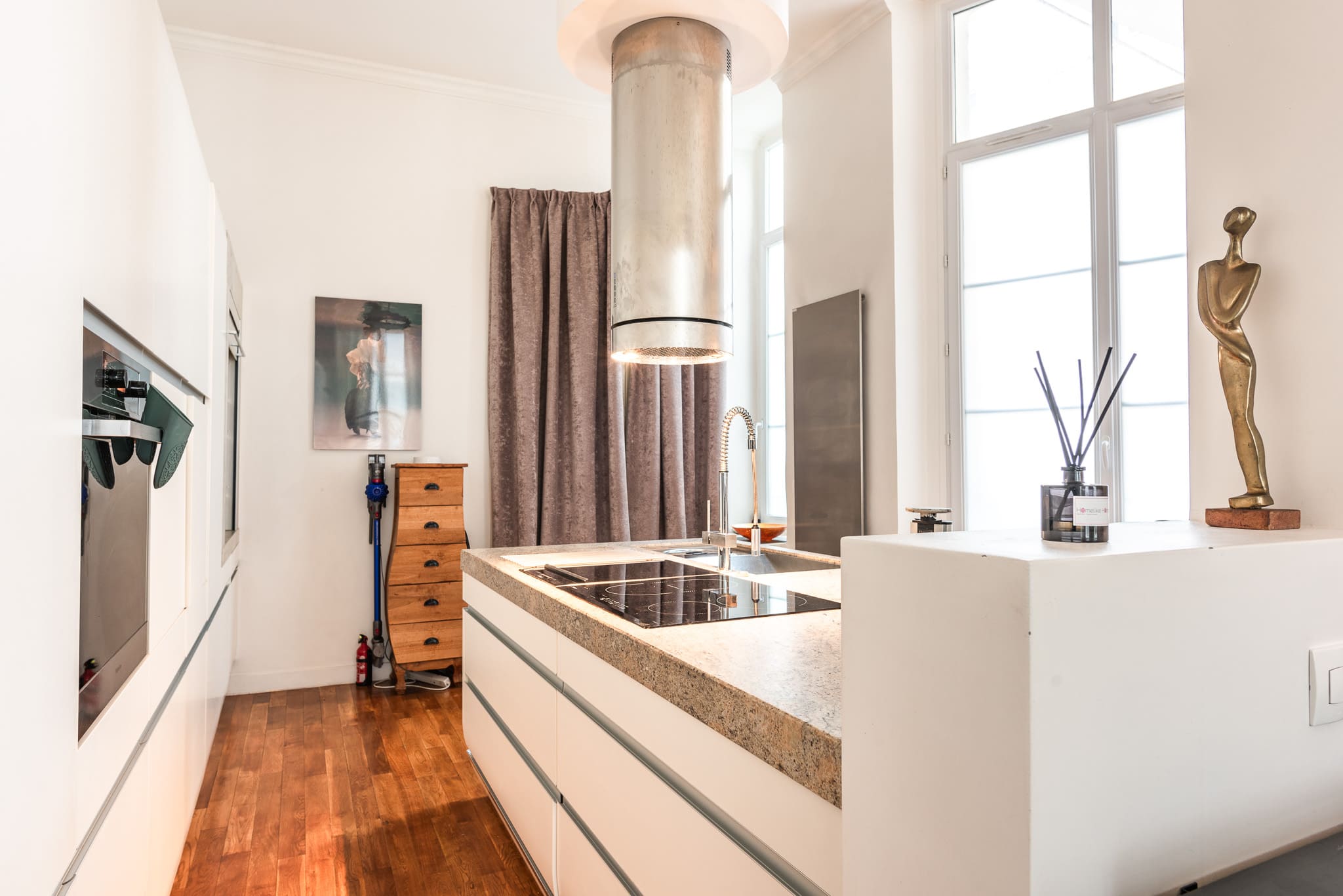 The apartment is a 115m2 (1200 sqft) spacious and fully equipped apartment. It has a large open kitchen with dining area, a big living room with sofas (1 is convertible) and TV, as well as 2 double bedrooms with each an en-suite bathroom. 1 separate WC. The kitchen is modern fully equipped : stove, oven, fridge, freezer, dishwasher, Nespresso, toaster, kettle, etc. Bedroom 1 : Double bedroom with king size bed (200x220), closet, private bathroom Bedroom 2 : Double bedroom with queen size bed (160x200), closet and private bathroom The apartment is located at the 2nd floor (no elevator) of a standing and charming building of the 17th century. It is very quiet and luminous whilst in the most exciting area : 5 min walk from the Louvre, 7 min walk from Opera, 2 min walk from the Grands Boulevards and Metro Station Richelieu Drouot.