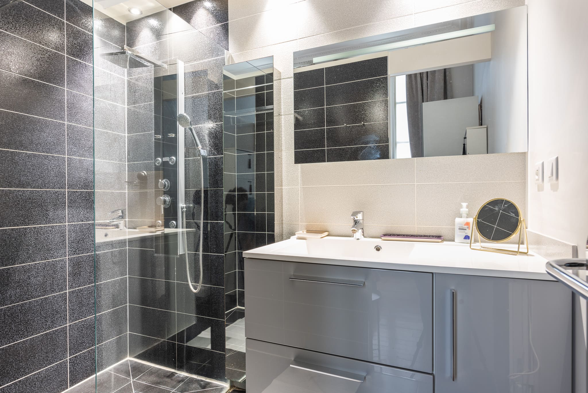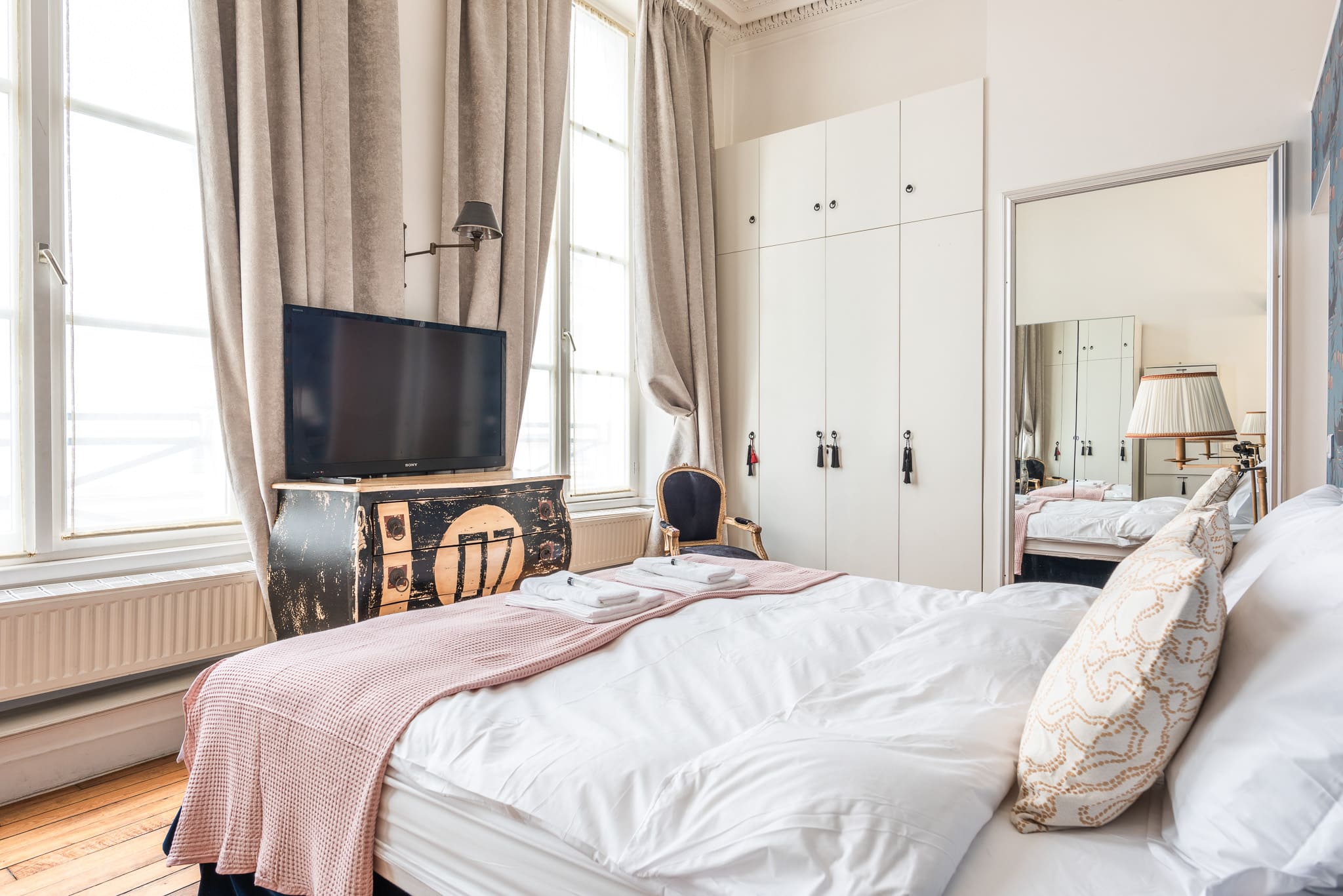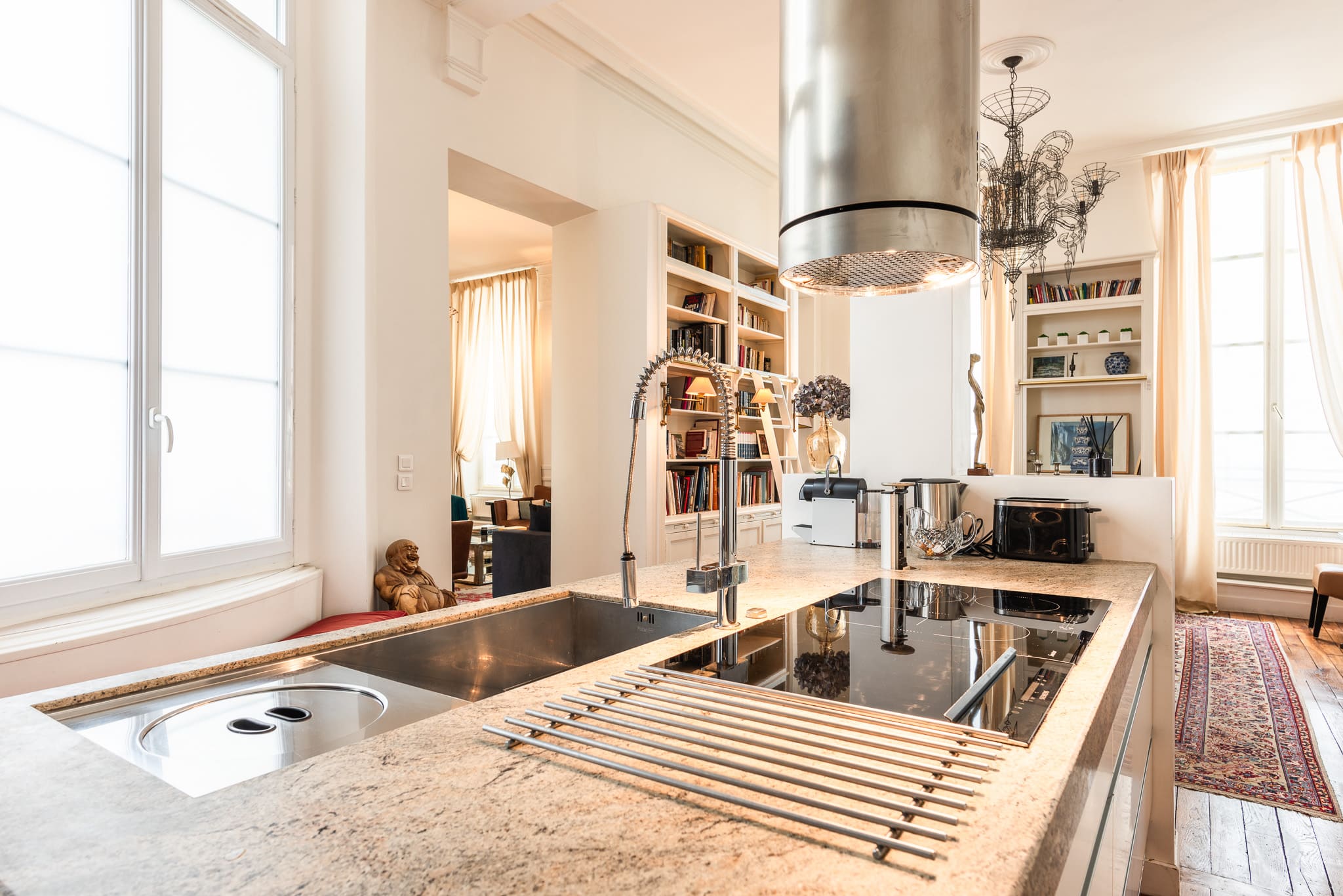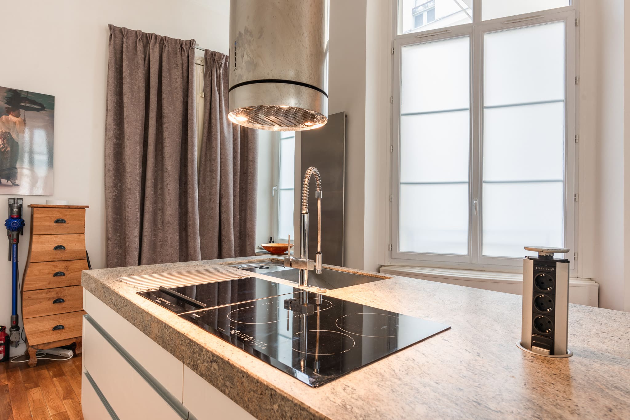 The apartment is a 115m2 (1200 sqft) spacious and fully equipped apartment. It has a large open kitchen with dining area, a big living room with sofas (1 is convertible) and TV, as well as 2 double bedrooms with each an en-suite bathroom. 1 separate WC. The kitchen is modern fully equipped : stove, oven, fridge, freezer, dishwasher, Nespresso, toaster, kettle, etc. Bedroom 1 : Double bedroom with king size bed (200x220), closet, private bathroom Bedroom 2 : Double bedroom with queen size bed (160x200), closet and private bathroom The apartment is located at the 2nd floor (no elevator) of a standing and charming building of the 17th century. It is very quiet and luminous whilst in the most exciting area : 5 min walk from the Louvre, 7 min walk from Opera, 2 min walk from the Grands Boulevards and Metro Station Richelieu Drouot.