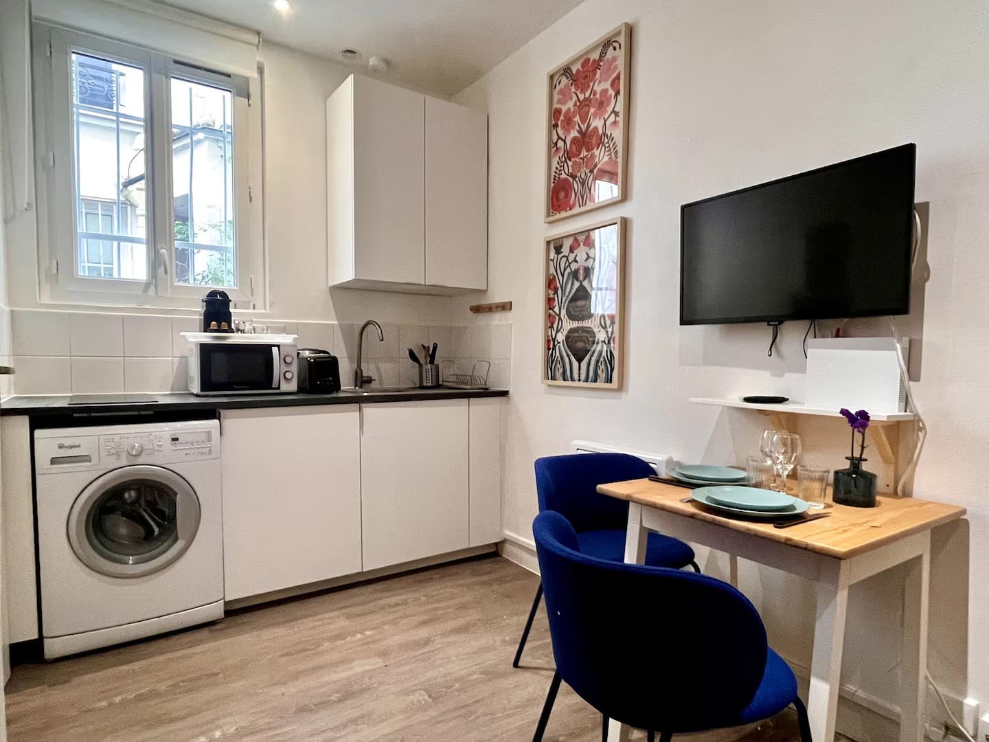 Nice studio with open kitchen : stove, microwave, utensils, fridge, Nespresso machine, kettle, toaster and washing machine. Night area with convertib...