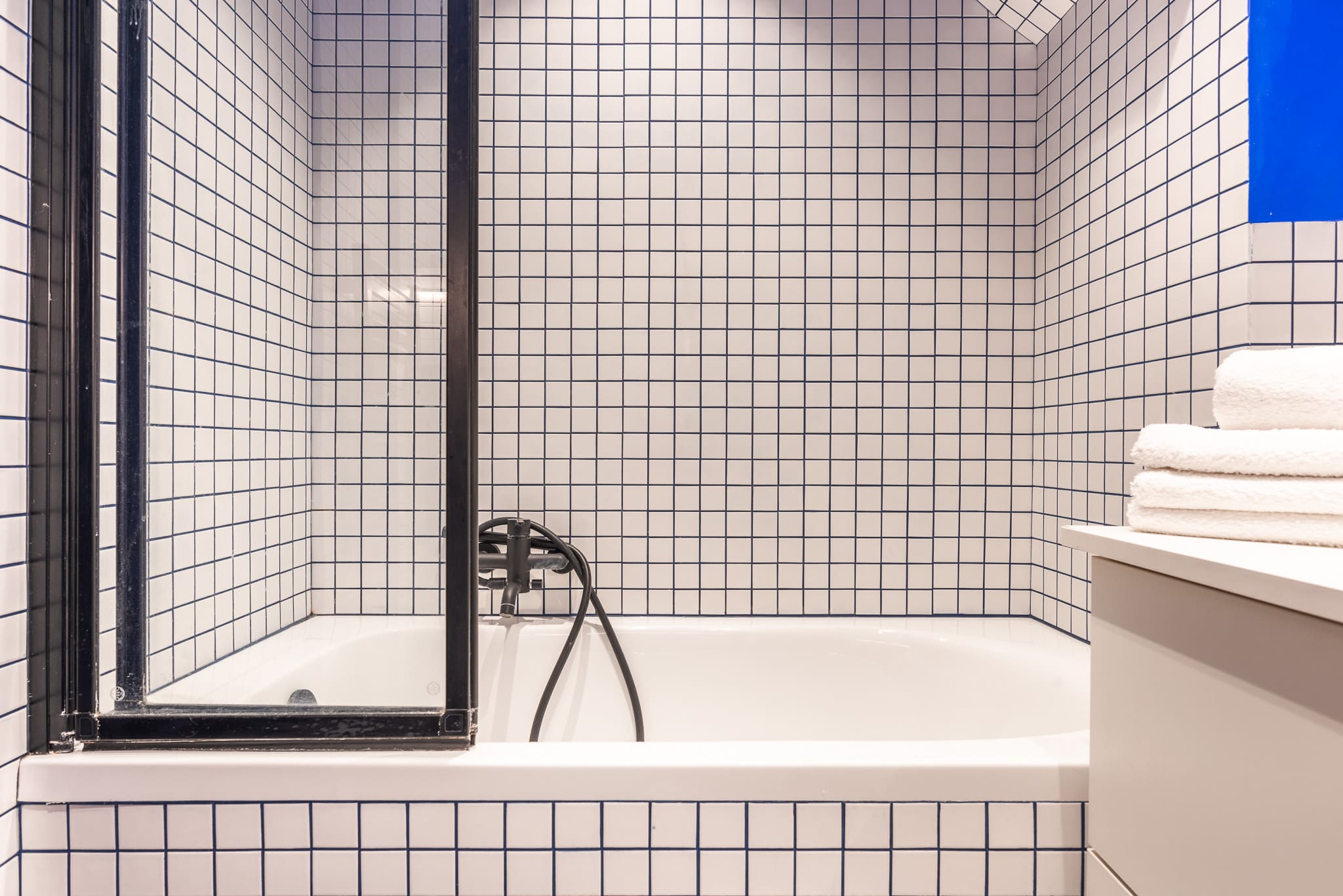 •1 double bedroom with queen size bed (160cm x 200cm), 1 bathroom with bathtub, living room and open kitchen with view of Paris
