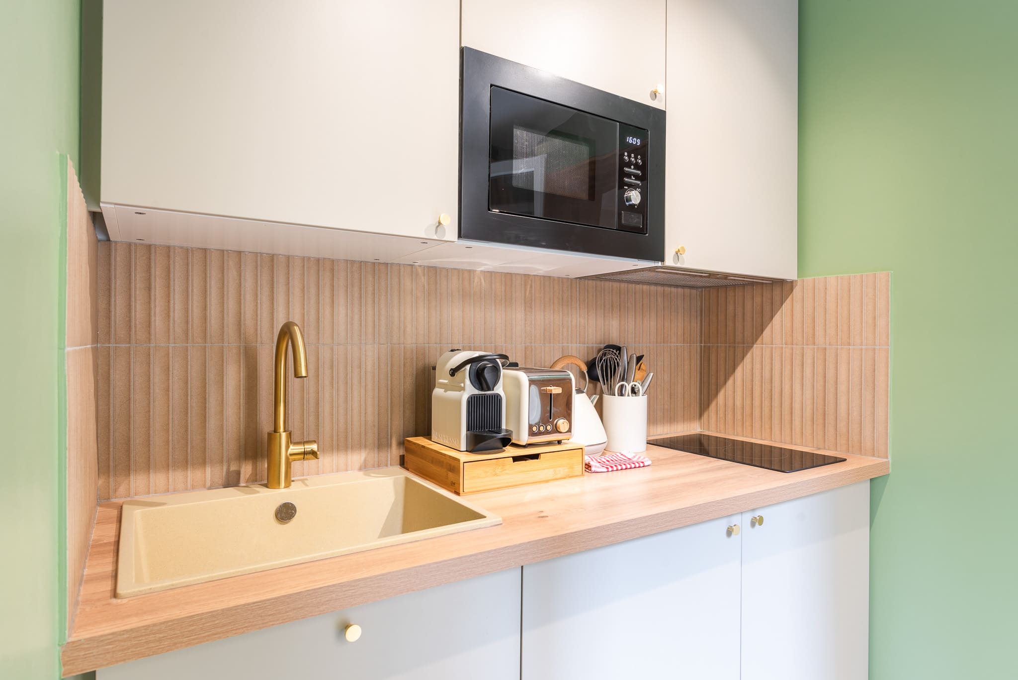 Charming studio equipped with a 5-star queen size bed, TV, high speed internet access, bathroom with shower and WC, kitchen with stove, microwave, fri...