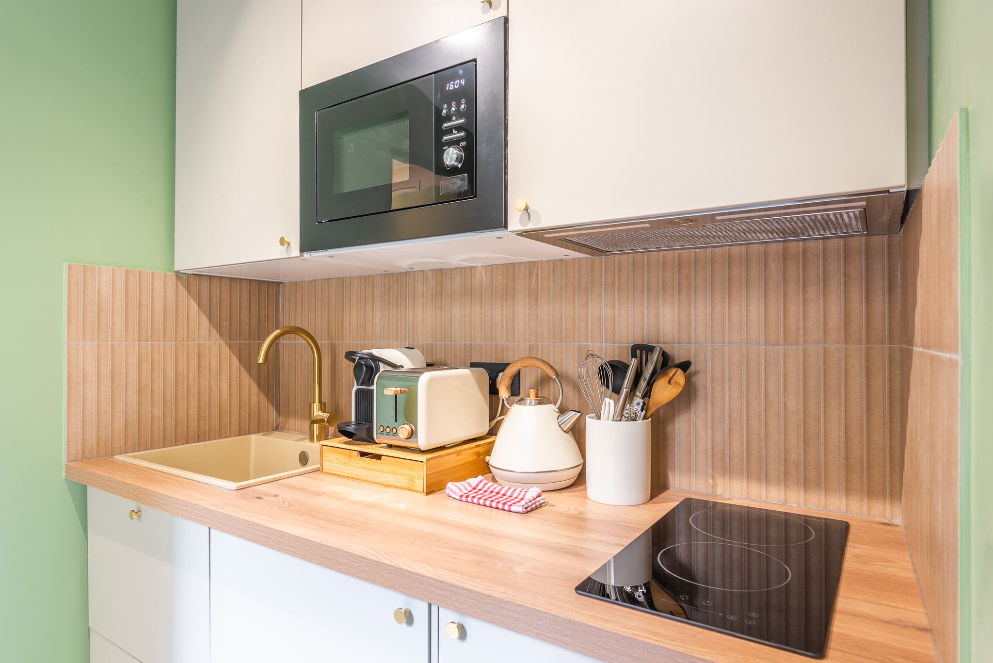 Bel appartement. Propre, lit confortable, salle de bain impeccable, cuisine et télévision fonctionnelles. Petit bémol pour le bruit. Malheureusement c’est assez mal isolé, en revanche la température est parfaite. Je recommande.